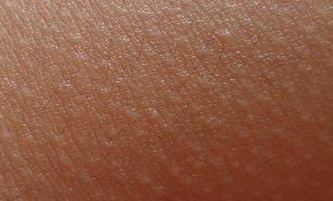 毛周角化初起为红色充实性丘疹,以后迅速发展成丘疹性脓疮,继而干燥、结痂,痂脱不留痕迹。皮疹数目多,但不融合,自觉瘙痒或轻度疼痛。